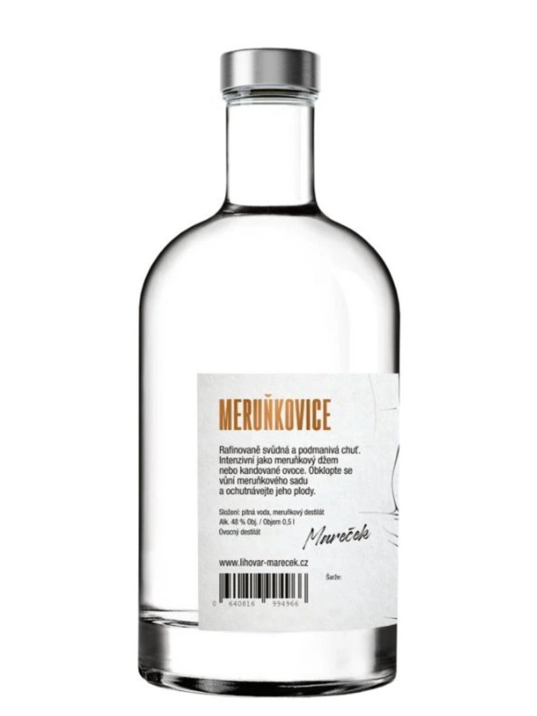 Meruňkovice Mareček je ovocný destilát třikrát destilovaný z kvasu vyzrálých meruněk. Díky tomu meruňkovice disponuje aromatickou vůni a plnou chutí a je vhodná i jako aperitiv. Vyrobeno pouze z českých meruněk z ovocných sadů od lokálních pěstitelů.
