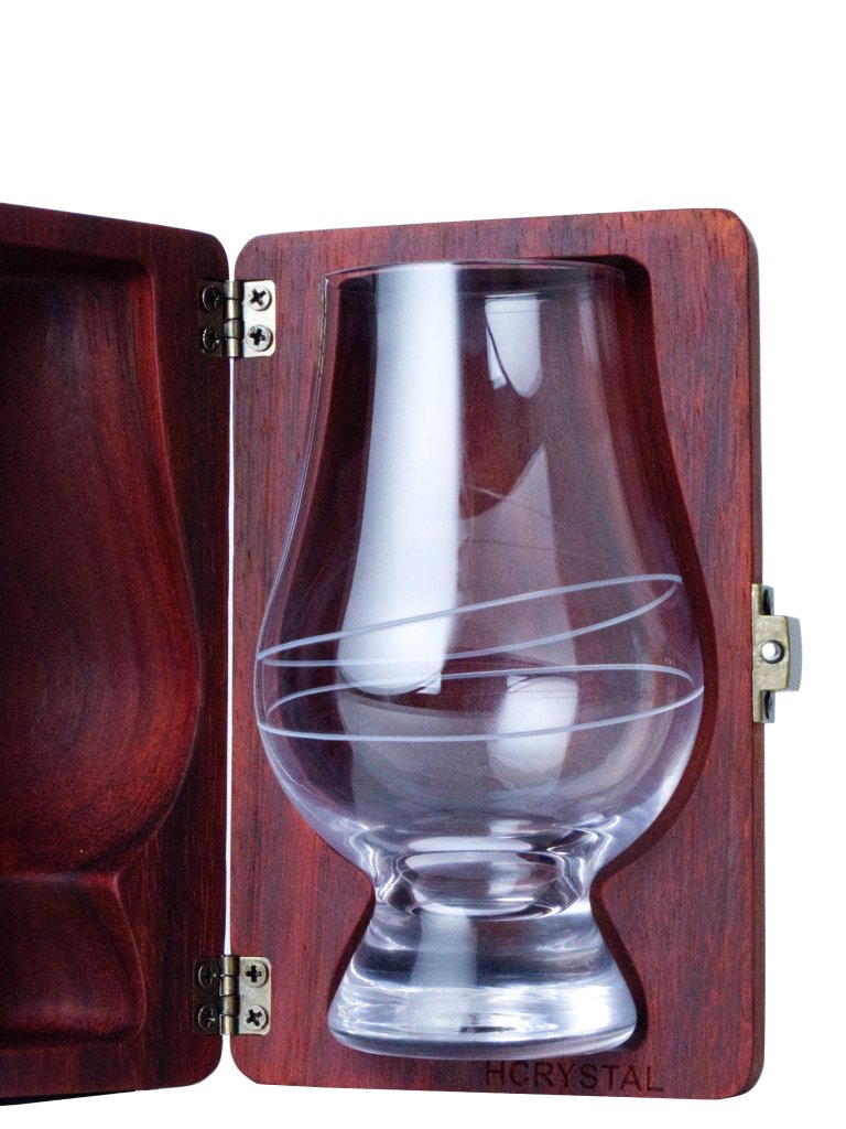 Uvnitř pouzdra s krásnou kresbou dřeva najdete Glencairn sklenku s decentním brusem.