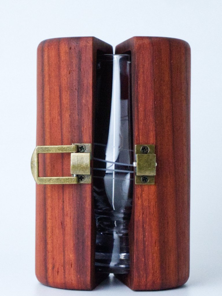 Řemeslná dokonalost není jen věcí destilátů. My se spojili s kamarádem, jehož rodina se věnuje broušení skla a opracování dřeva. Obojí dělají na špičkové úrovni a tak vzniklo toto exkluzivní pouzdro, na které se použilo rovněž exkluzivní dřevo. Africký padouk.